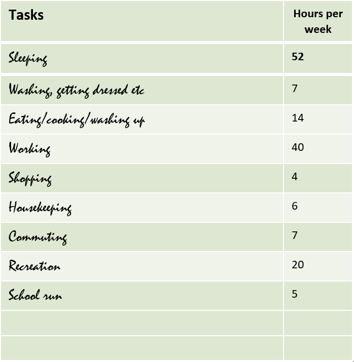 168 are the hours in a week. There are no more, no less, hours available to us. Scribble down all the things you have to do in the week and all the things you would like to do. Below are some examples.